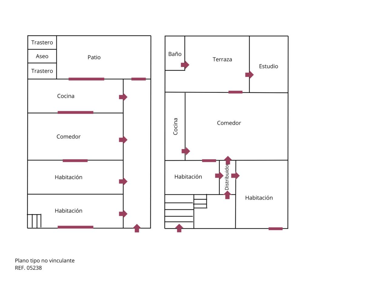 Casa en venta para reformar de 230m² en dos plantas. En planta baja tenemos: comedor con salida a patio, cocina, dos habitaciones dobles, un aseo y pozo. Accedemos a la primera planta y tenemos un amplio distribuidor que nos da paso a la zona de día, con amplio comedor con salida a la Terraza cubierta con vistas al patio, un estudio que nos comunica con la planta baja, cocina y baño con ducha, en la zona de noche tenemos dos habitaciones, la principal de 20m² con salida a balcón con vistas a la calle.